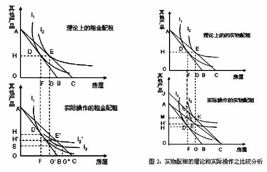 依据消费者效用理论的假设,理论上的实物配租如图2上图所示,其消费者效用与租金配租结果相同,它可以在短期内迅速解决低收入家庭的住房困难,使他们的居住条件达到政府期望的标准,补贴效果非常明显。