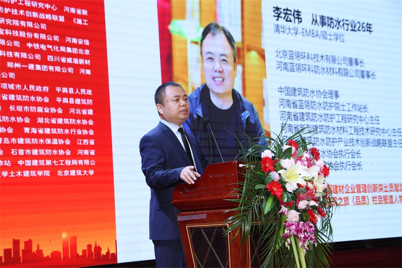 会上举办了河南省建筑防水防护工程研究中心智库专家聘任仪式,河南省建筑防水防护工程研究中心主任、蓝翎环科董事长李宏伟介绍了研究中心的建设情况。河南省建筑防水防护工程研究中心,是由河南省发改委唯一授予的建筑防水防护行业省级创新平台。目的汇集建筑防水防护领域的专业人才、优质企业、院校及科研单位,通过整合技术资源,解决防水工程中的疑难问题。发挥工程研究中心在行业中的辐射与扩散作用,对于提高行业自主创新能力,提高现有科技成果的成熟性、配套性和工程化水平,从而达到提高防水工程质量具有深远意义。