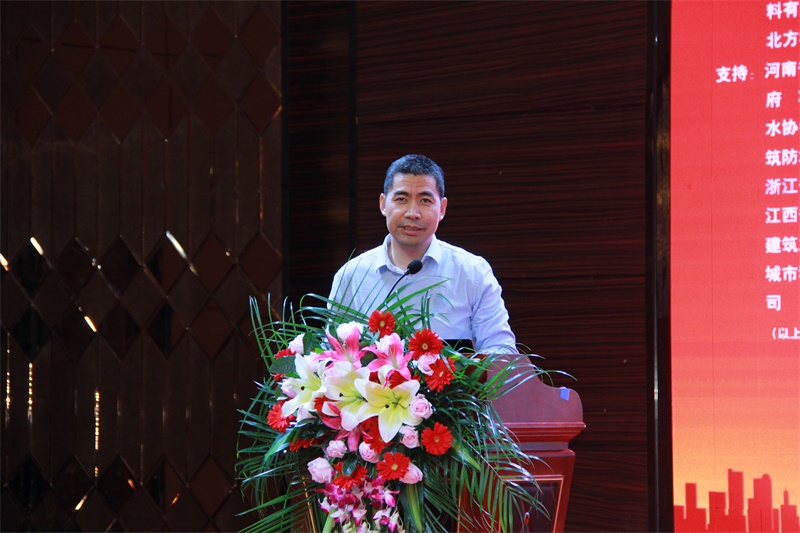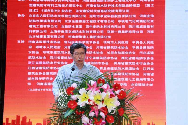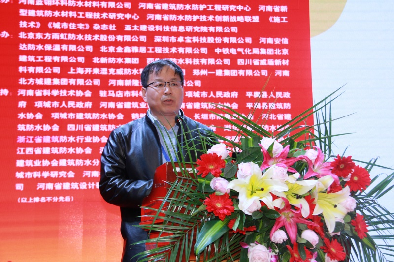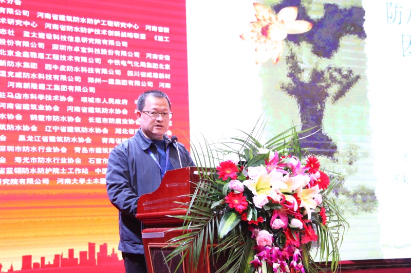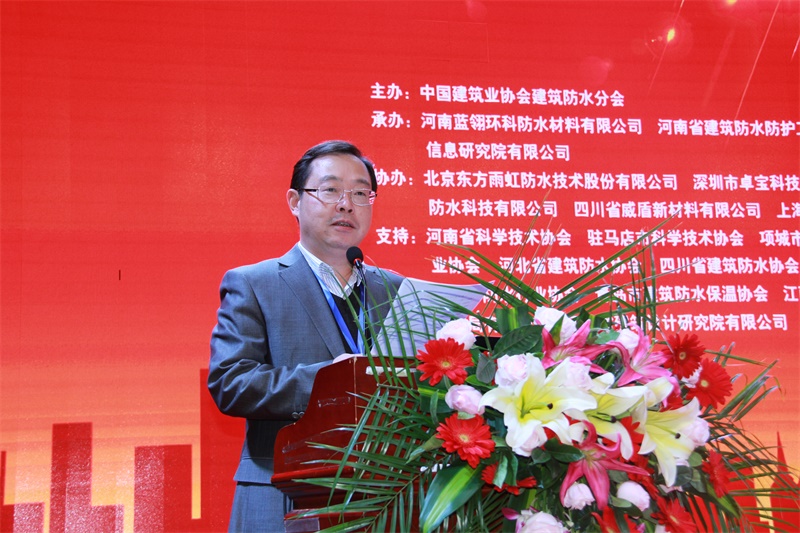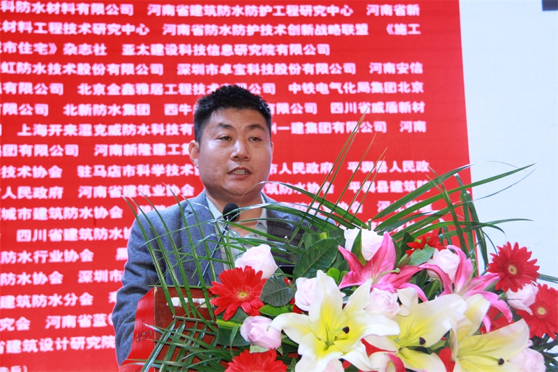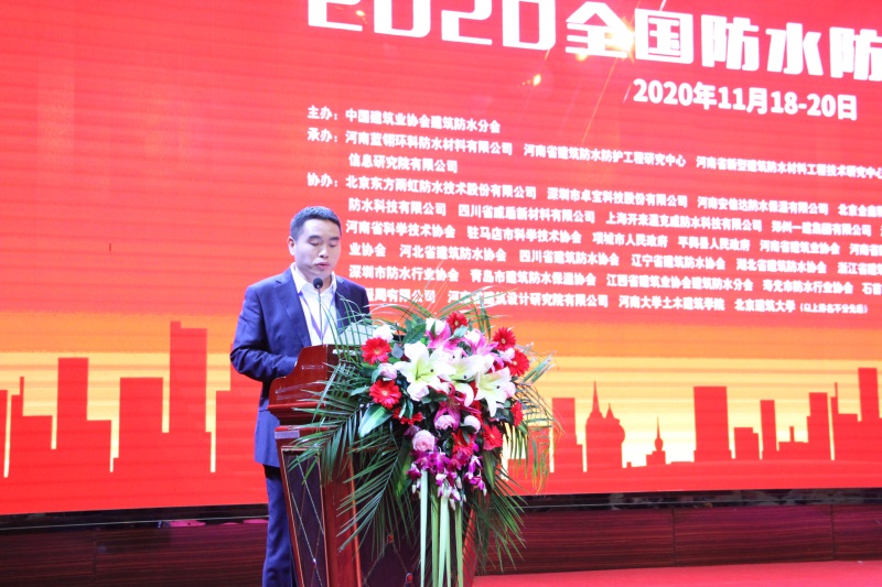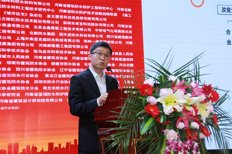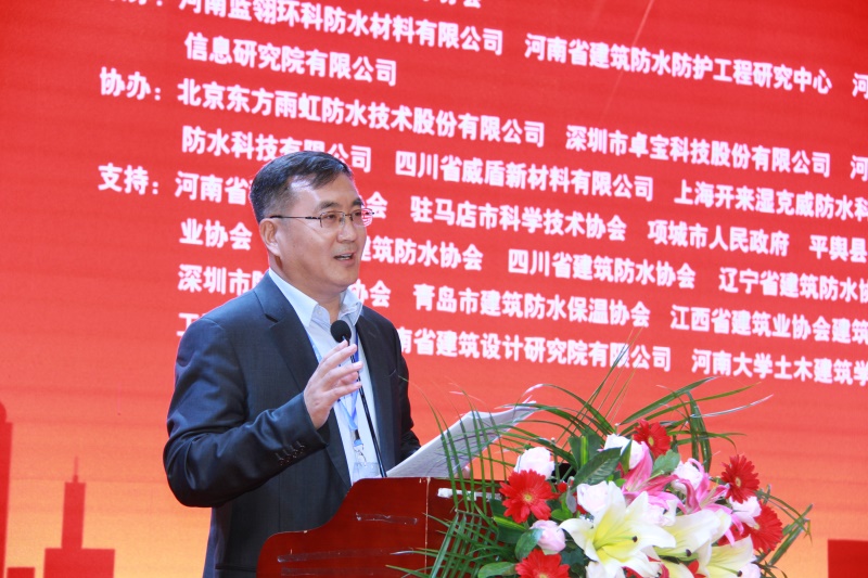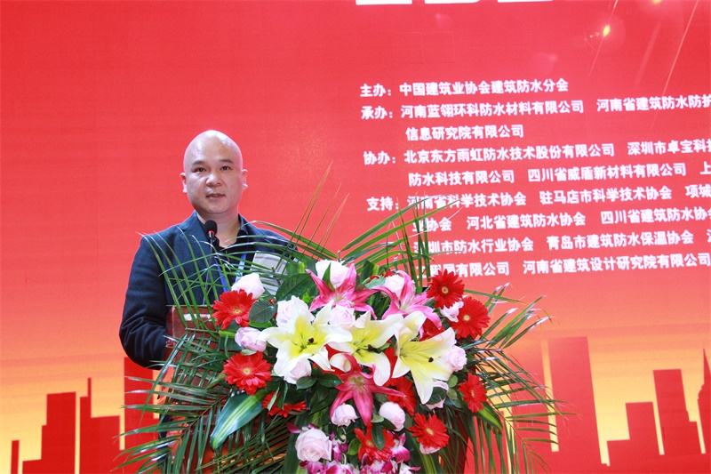 河南省建筑防水防护工程研究中心主任、蓝翎环科董事长李宏伟代表承办单位致辞。他对分会领导、专家的支持表示感谢,并热情邀请与会代表到老家平舆感受防水之乡的风采和当地人民的热情。他说,防水同仁应共同聚力、携手砥砺前行,方能开创出新的局面;作为承办方,愿与同行多交流学习,共促行业防水技术水平的提高。