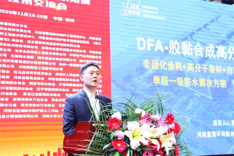 河南蓝翎环科防水材料有限公司总工程师苏怀武介绍了DFA胶黏合成高分子防水系统,非固化+高分子卷材+自粘卷材=三合一产品。单层一级防水解决方案,节约综合成本45%。
