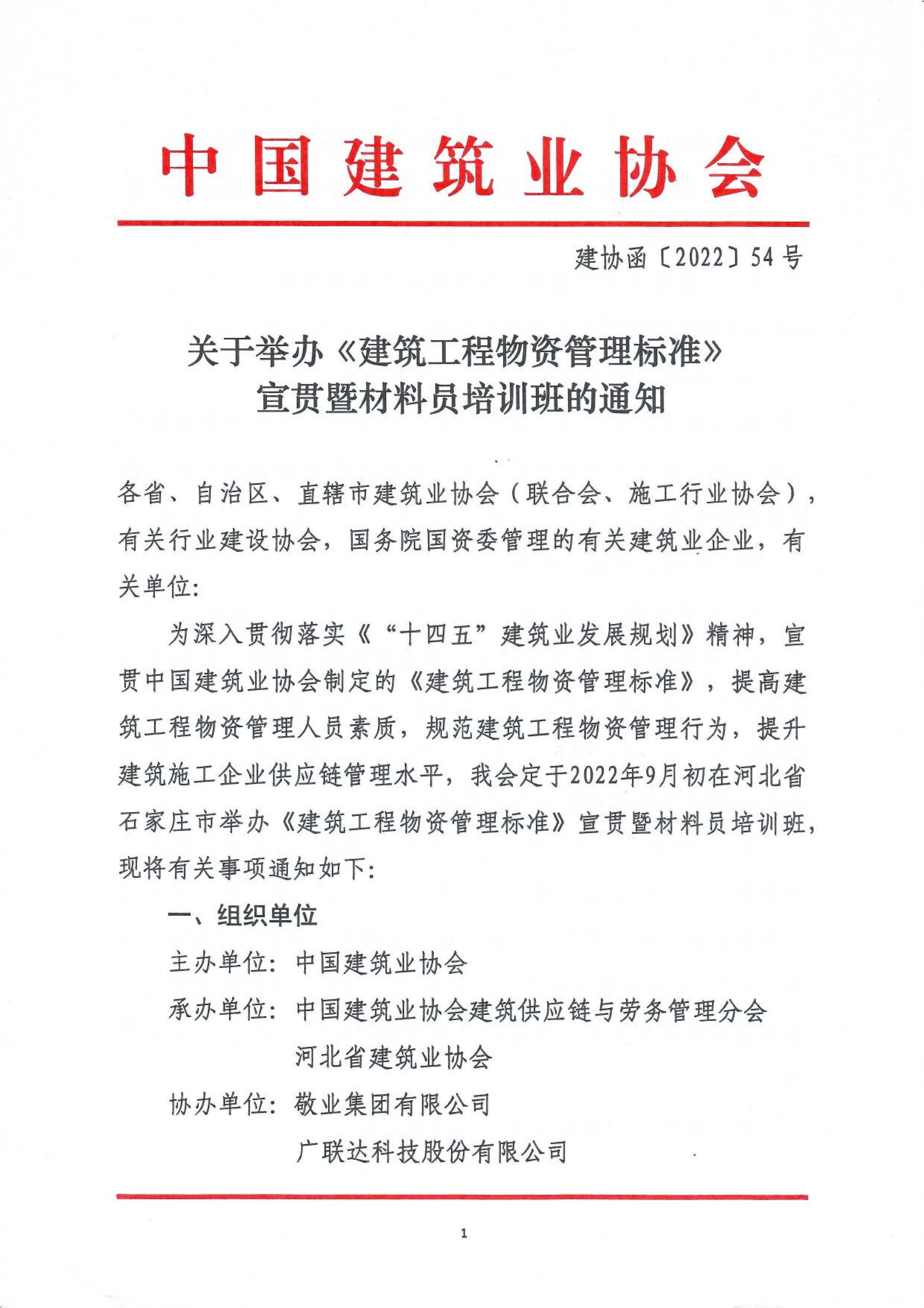 关于举办《建筑工程物资管理标准》宣贯暨材料员培训班的通知