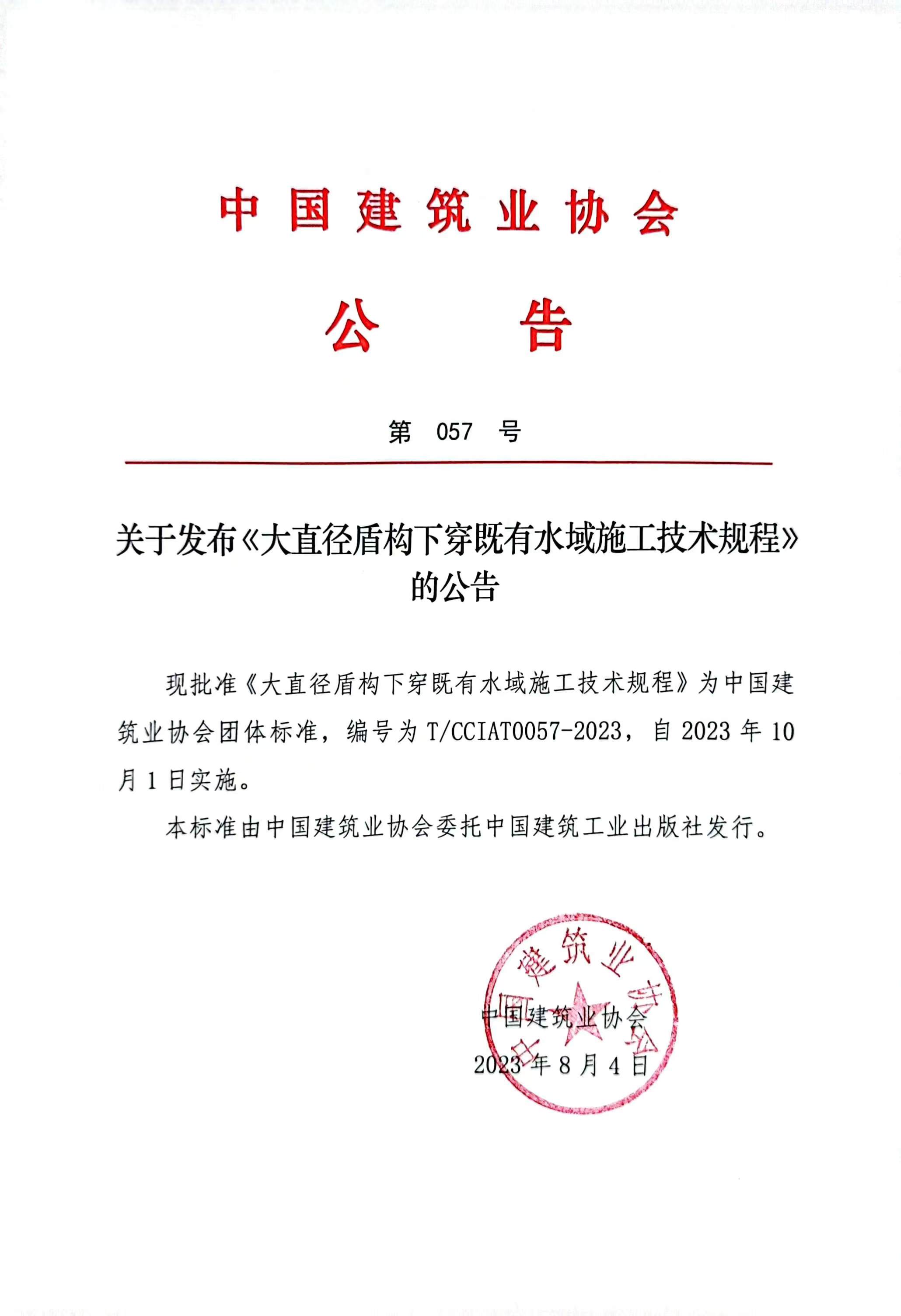 关于发布《大直径盾构下穿既有水域施工技术规程》的公告