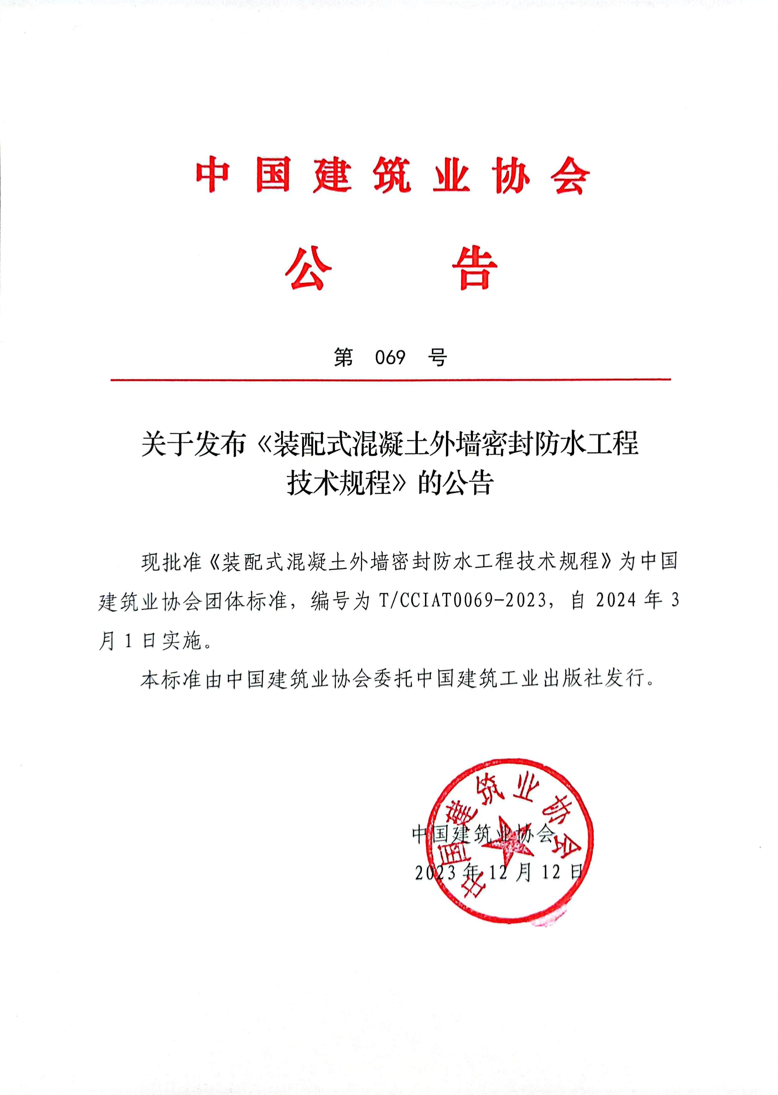 关于发布《装配式混凝土外墙密封防水工程技术规程》的公告