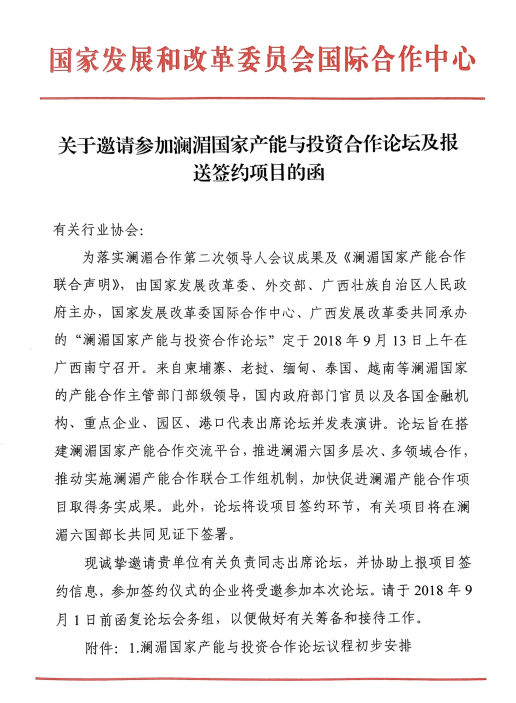 附件:《关于邀请参加澜湄国家产能与投资合作论坛及报送签约项目的函》