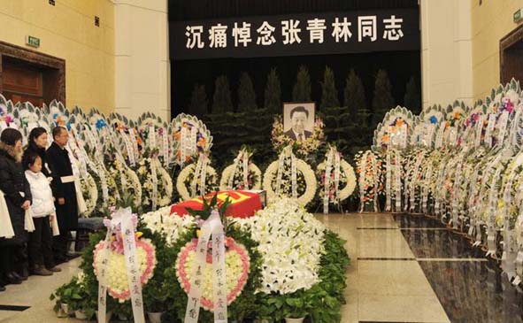 26日上午,八宝山殡仪馆东礼堂庄严肃穆,哀乐低回,礼堂上方悬挂的黑色白底的横幅,上面写着“沉痛悼念张青林同志”,横幅下方是张青林同志的遗像,张青林同志的遗体安卧在鲜花翠柏丛中,身上覆盖着鲜红的中国共产党党旗。