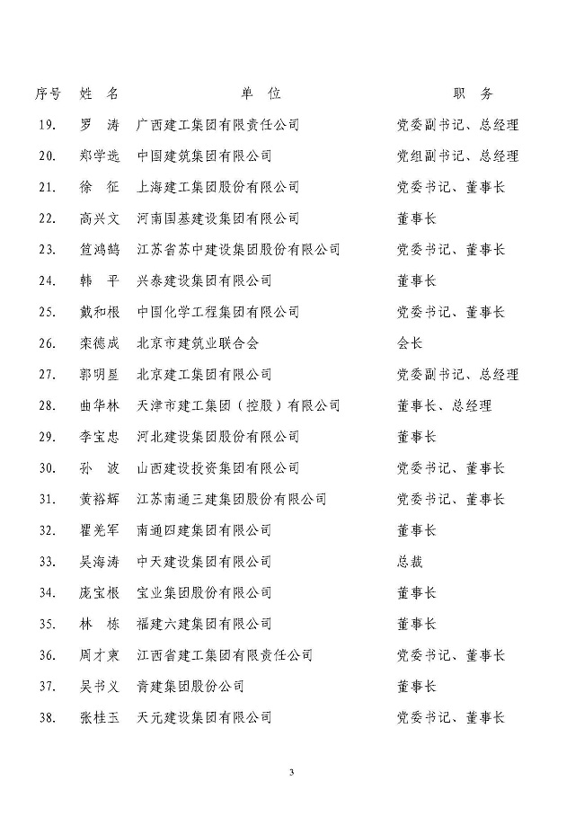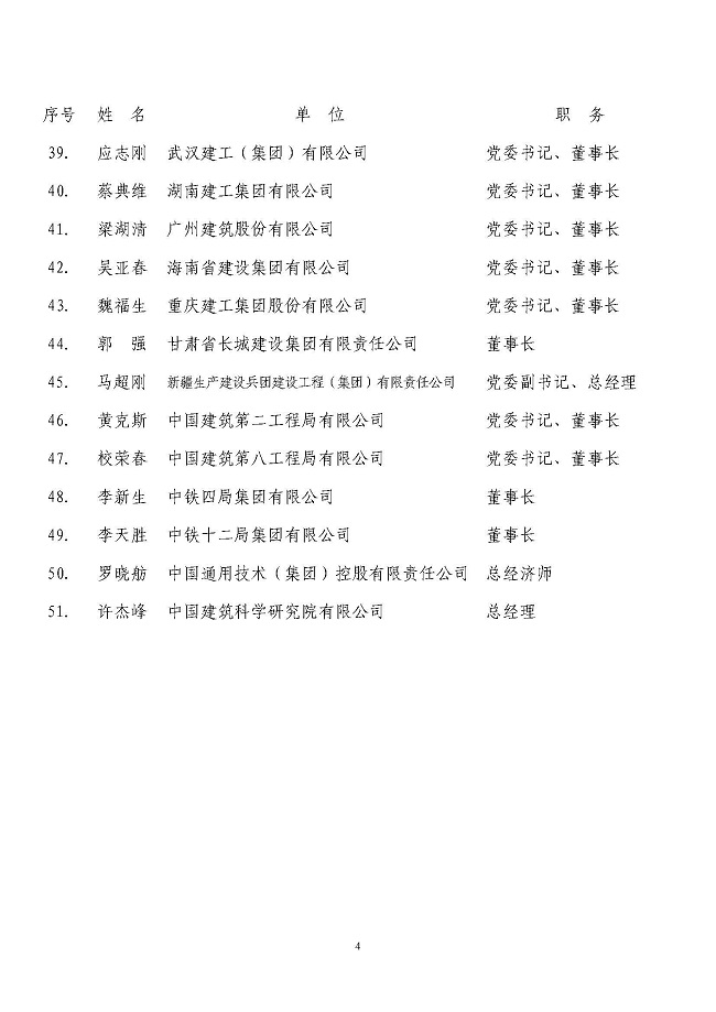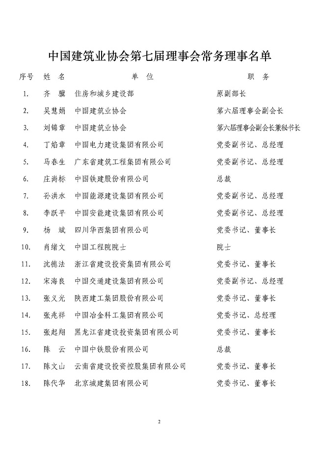 各省、自治区、直辖市建筑业协会(联合会、施工行业协会),有关行业建设协会,解放军工程建设协会,国资委管理的有关建筑业企业,本会单位会员: 我会于2020年8月28日召开了七届一次理事会,会上无记名投票选举产生了第七届理事会常务理事51名。现将常务理事名单予以公布。