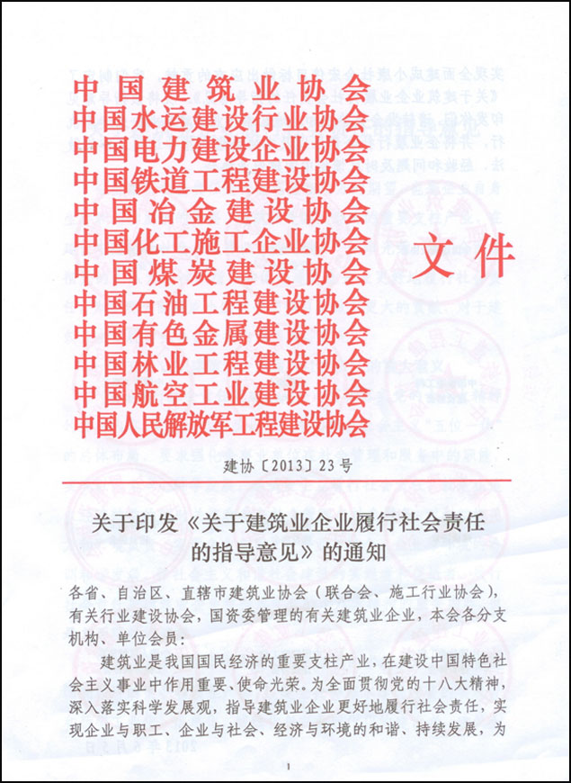 企业履行社会责任是社会利益相关方的期望,也是企业自身生存和持续发展的需要。建筑业是国民经济的重要支柱产业,在建设中国特色社会主义事业中作用重要、使命光荣。为了全面贯彻党的十八大精神,指导和促进建筑业企业更好地履行社会责任,为实现全面建成小康社会宏伟目标做出更大的贡献,对于建筑业企业履行社会责任提出以下指导意见: