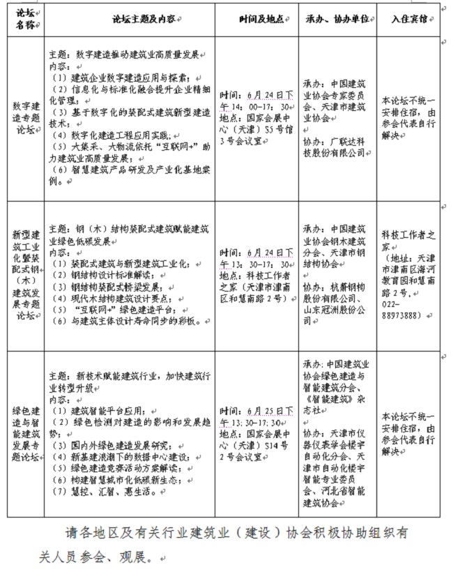 为积极践行习近平总书记关于“中国制造、中国创造、中国建造共同发力,继续改变着中国的面貌”的重要论述,不断推进建筑业高质量发展,我会将与中国对外贸易中心、中国建筑科学研究院有限公司共同举办首届绿色智慧建筑博览会。届时,还将举办“国际工程项目管理”、“数字建造”、“新型建筑工业化暨装配式钢(木)建筑发展”、“绿色建造与智能建筑发展”专题论坛。现将有关事项通知如下: