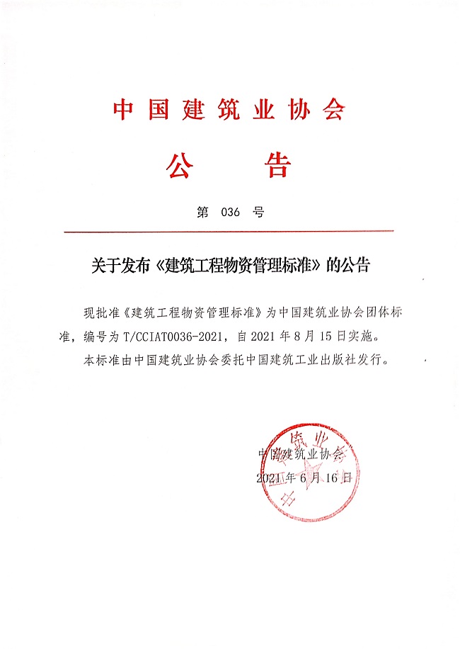 关于发布《建筑工程物资管理标准》的公告