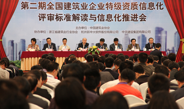 会上,特级资质标准编写专家徐和麟、邱岩分别就《施工总承包企业特级资质标准实施办法》和《施工总承包企业特级资质信息化考评标准》进行了详细的解读,并对相关问题进行现场答疑。中天建设集团、四川华西集团、中国水利水电二局、中建一局集团建设发展有限公司等五家建筑企业介绍了本企业信息化建设的经验; 杭州新中大软件股份有限公司、北京华建互联科技发展有限公司分别介绍了建筑企业信息化技术开发与应用情况。会议现场气氛热烈,企业学习热情高涨,达到了预期效果。