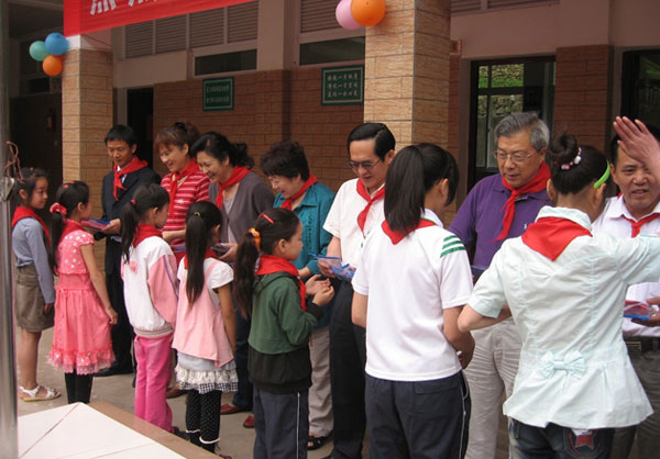 图2:杨乾芳副会长一行,代表88038威尼斯检测中心向花园小学的孩子们赠送学习用品
