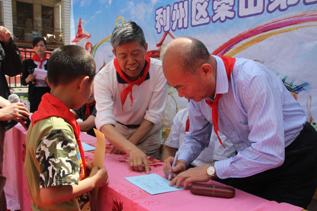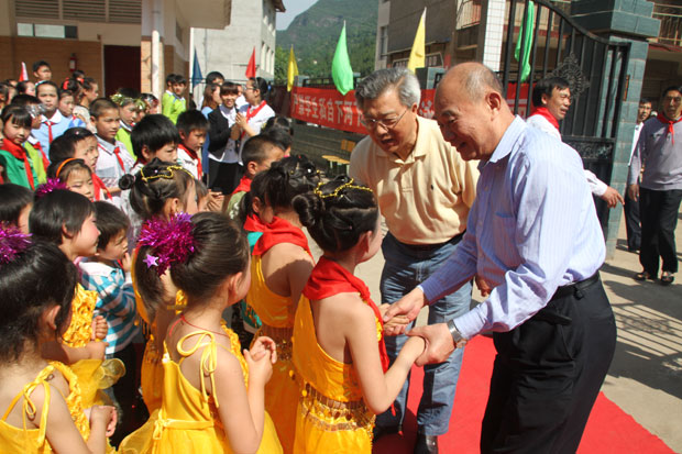6月1日上午,地处川北深山的花园小学,阳光明媚、草木青翠,彩旗招展、鼓乐欢快,师生们身着节日服装,整队迎接远道而来的贵宾。我协会“捐助花园小学贫困学生”的捐助仪式在这里举行。