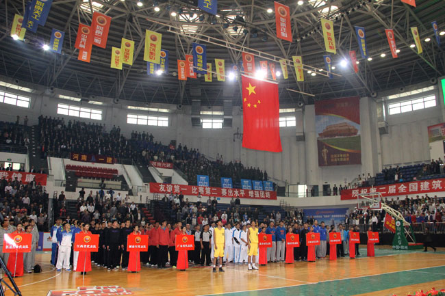 伴随着激昂的运动员进行曲,来自北京、上海、陕西、河南等地区的12支球队以饱满的精神、昂扬的斗志健步入场,受到了全场观众的热烈欢迎,展现了建筑业企业职工奋发向上的精神面貌。