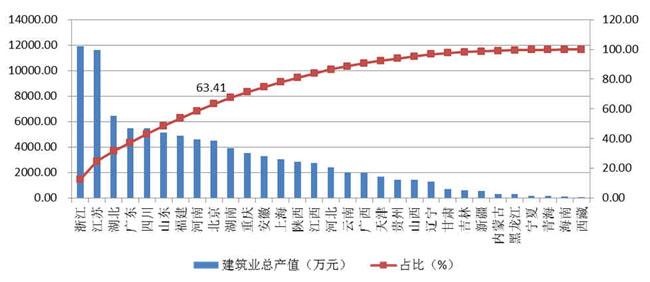 除浙江、江苏两省外,总产值超过4000亿元的还有湖北、广东、四川、山东、福建、河南和北京共7个地区,上述9省市完成的建筑业总产值占全国建筑业总产值的63.41%(图1)。