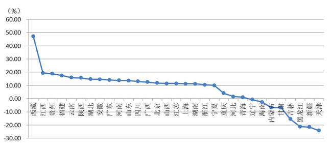 从各地区建筑业总产值增长情况看,有23个地区的建筑业总产值较上年同期有不同幅度的增长。其中,西藏、江西、贵州、福建、云南、陕西的增幅均超过15%。有8个地区出现负增长,其中,天津、新疆、黑龙江、吉林出现了15%以上的负增长(图2)。