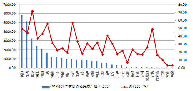 图4 2018年上半年各地区跨省完成的建筑业总产值及外向度