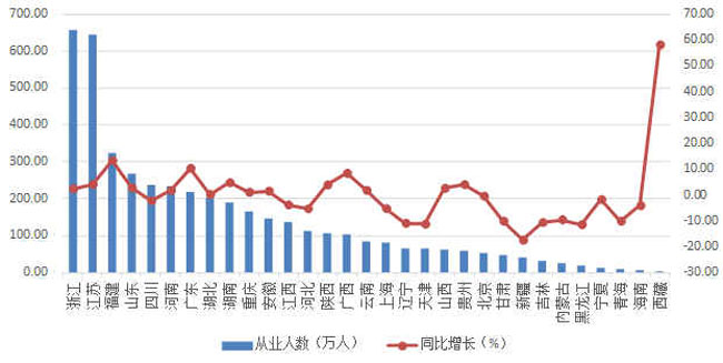 2018年上半年,全国建筑业从业人数超过百万的地区共15个。浙江、江苏依然是从业人数大省,人数分别达到658.04万人和643.60万人。福建、山东、四川、河南、广东、湖北等6省从业人数均超过200万人。与上年同期相比,16个地区的从业人数增加,其中,增加人数最多的是福建,增加38.15万人;15个地区的从业人数减少,其中,减少最多的是新疆,减少8.76万人。从业人数增幅最大的是西藏,达到58.09%;增幅最小的是新疆,下降了17.44%(图5)。