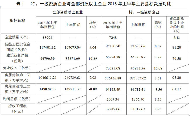 住房和城乡建设部汇总的7248个特、一级资质建筑业企业2018年上半年主要指标数据如下(表1)。