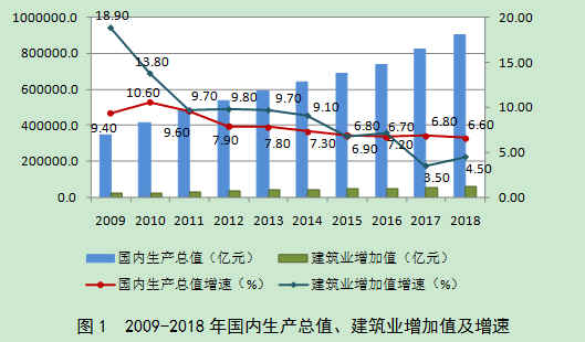 经初步核算,2018年全年国内生产总值900309亿元,比上年增长6.60%。全年全社会建筑业实现增加值61808亿元,比上年增长4.50%,增速低于国内生产总值增速2.10个百分点(图1)。