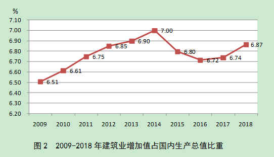 自2009年以来,建筑业增加值占国内生产总值的比例始终保持在6.5%以上。2018年达到了6.87%的较高点,在2015年、2016年连续两年下降后连续两年出现回升(图2),建筑业国民经济支柱产业的地位稳固。
