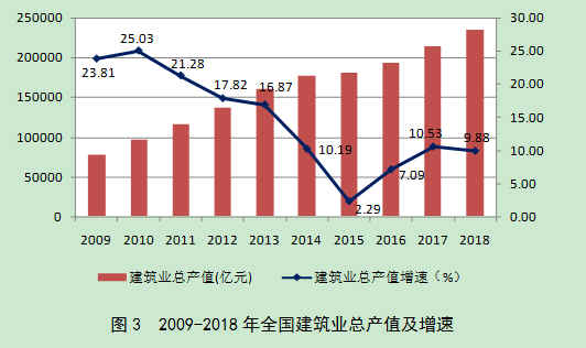 近年来,随着我国建筑业企业生产和经营规模的不断扩大,建筑业总产值持续增长,2018年达到235085.53亿元,比上年增长9.88%,增速比上年降低了0.65个百分点。(图3)。