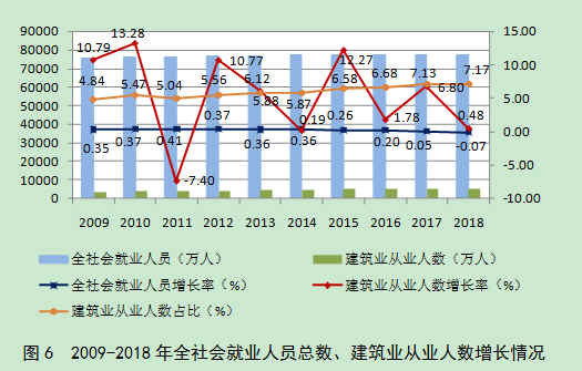 2018年底,全社会就业人员总数77586万人,其中,建筑业从业人数5563.30万人,比上年末增加26.40万人,增长0.48%。建筑业从业人数占全社会就业人员总数的7.17%,比上年提高0. 04个百分点,占比再创新高(图6)。建筑业在吸纳农村转移人口就业、推进新型城镇化建设和维护社会稳定等方面继续发挥显著作用。