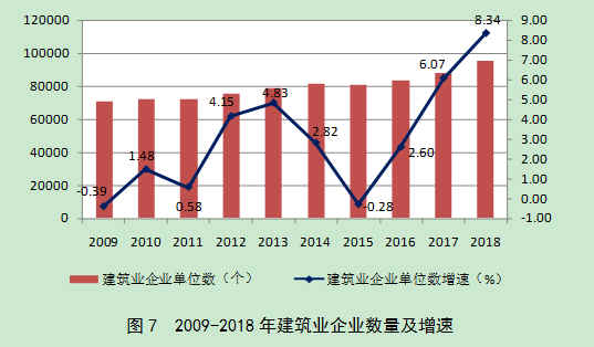 截至2018年底,全国共有建筑业企业95400个,比上年增加7341个,增速为8.34%,比上年增加了2.26个百分点,增速连续三年增加(图7)。国有及国有控股建筑业企业6880个,比上年增加80个,占建筑业企业总数的7.21%,比上年下降了0.51个百分点。