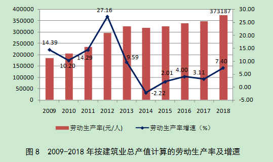 2018年,按建筑业总产值计算的劳动生产率为373187元/人,比上年增长7.40%,增速比上年提高4.29个百分点,劳动生产率水平再创新高(图8)。