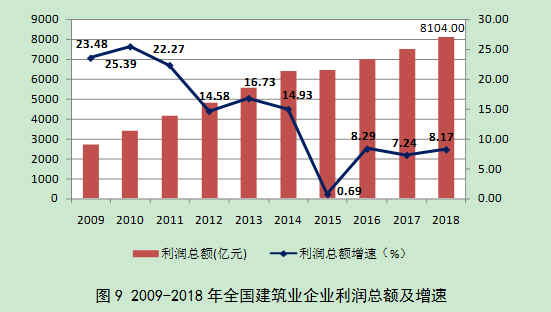 2018年,全国建筑业企业实现利润总额8104亿元,比上年增加612.22亿元,增速为8.17%,增速比上年提高0.93个百分点(图9)。