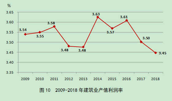 近10年来,建筑业产值利润率(利润总额与总产值之比)一直在3.5%上下徘徊。2018年,建筑业产值利润率为3.45 %,比上年降低了0.05个百分点,连续两年出现下滑(图10)。