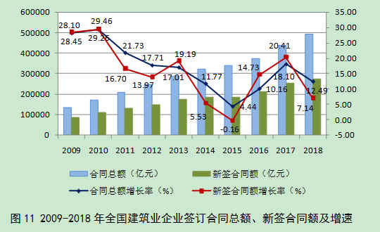 2018年,在以习近平同志为核心的党中央坚强领导下,建筑业深入学习贯彻习近平新时代中国特色社会主义思想和党的十九大和十九届二中、三中全会精神,改革创新,开拓进取,加快推动建筑业改革发展,建筑业发展质量和效益不断提升。全国建筑业企业(指具有资质等级的总承包和专业承包建筑业企业,不含劳务分包建筑业企业,下同)完成建筑业总产值235085.53亿元,同比增长9.88%;完成竣工产值120786.22亿元,同比增长3.42%;签订合同总额494409.05 亿元,同比增长12.49%,其中新签合同额272854.07亿元,同比增长7.14%;房屋施工面积140.89亿平方米,同比增长6.96%;完成房屋竣工面积41.35亿平方米,同比下降1.33%;实现利润8104亿元,同比增长8.17%。截至2018年底,全国有施工活动的建筑业企业95400个,同比增长8.34%;从业人数5563.30万人,同比增长0.48%;按建筑业总产值计算的劳动生产率为373187元/人,同比增长7.40%。