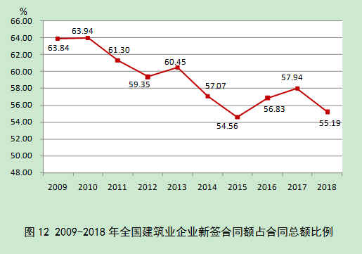 2018年,全国建筑业企业签订合同总额494409.05亿元,比上年增长12.49%,增速比上年下降5.61个百分点。其中,本年新签合同额272854.07亿元,比上年增长了7.14%,增速比上年下降13.27个百分点(图11)。本年新签合同额占签订合同总额比例为55.19%,比上年降低了2.75个百分点(图12)。