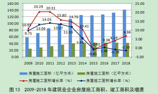 2018年,全国建筑业企业房屋施工面积140.89亿平方米,比上年增长6.96%,增速连续三年保持增长。竣工面积41.35亿平方米,比上年下降1.33%,连续两年出现下降(图13)。