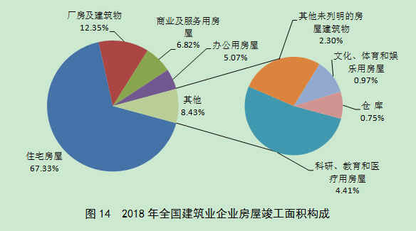 从全国建筑业企业房屋竣工面积构成情况看,住宅竣工面积占比最大,为67.33%;厂房及建筑物竣工面积占12.35%;商业及服务用房竣工面积、办公用房屋竣工面积分别占6.82%和5.07%;其他种类房屋竣工面积占比均在5%以下(图14)。