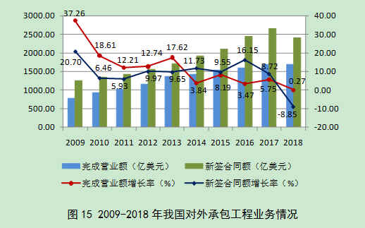 2018年,我国对外承包工程业务完成营业额1690.40亿美元,比上年增长0.27%,增速比上年降低5.48个百分点。新签合同额2418亿美元,比上年减少8.85%,增速比上年下降了17.57个百分点(图15)。