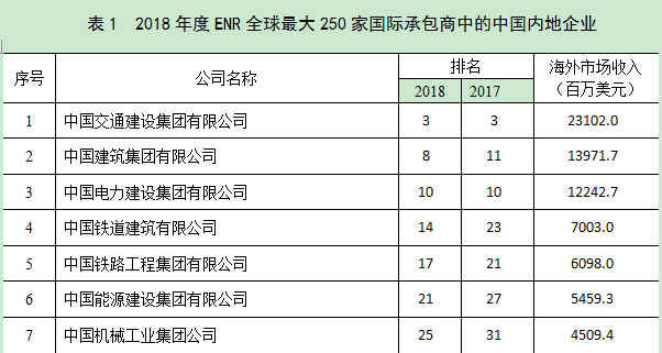 美国《工程新闻记录》(简称“ENR”)杂志公布的2018年度全球最大250家国际承包商共实现海外市场营业收入4824亿美元,比上一年度增长了3.1%,终止了持续三年的下滑趋势。我国内地共有69家企业入选2018年度全球最大250家国际承包商榜单,入选数量比上一年度增加了4家。入选企业共实现海外市场营业收入1141亿美元,比上年增长了15.6%,占250家国际承包商海外市场营业收入总额的23.7 %,比上年提高2.6个百分点。