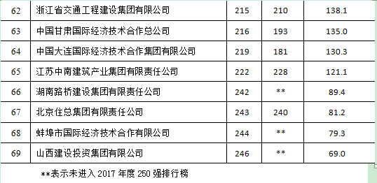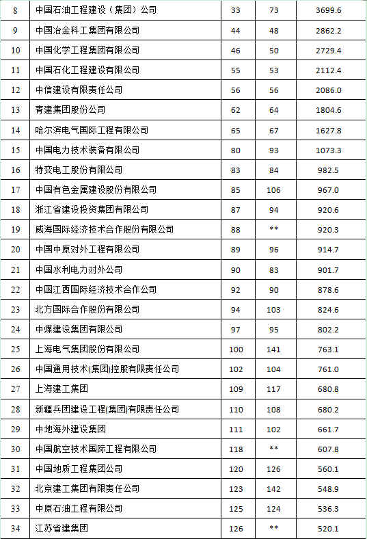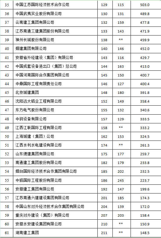 69家上榜企业中,有32家企业排名比上一年度有所提升,23家企业排名下降,排名未发生变化的3家,新进榜企业11 家。中国交通建设股份有限公司连续11年排名中国上榜企业首位,名次继续保持在第3位。中国建筑集团有限公司也首次进入10强,排在第8位(表1)。