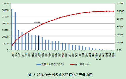 除苏、浙两省外,总产值超过1万亿元的还有湖北、广东、四川、山东、福建、河南和北京7个省市,上述9省市完成的建筑业总产值占全国建筑业总产值的63.03%(图16)。