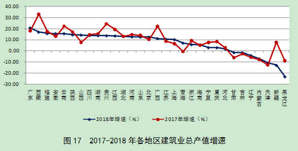 从各地区建筑业总产值增长情况看,有24个地区的建筑业总产值增长,14个地区的增速高于上年。广东、西藏、福建、安徽和云南分别以20.59%、16.83%、15.56%、15.51%和和15.49 %的增速位居前五位。7个地区的建筑业总产值出现负增长,其中,黑龙江、新疆、天津出现了低于-10%的负增长,分别为-23.45%、-13.10%和-11.06%(图17)。