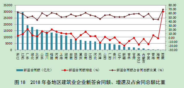2018年,全国建筑业企业新签合同额272854.07 亿元,比上年增长7.14%,增速较上年降低了13.27个百分点。浙江、江苏两省建筑业企业新签合同额继续占据前两位,分别达到30435.75亿元、29746.22亿元,占各自签订合同额总量的62.92%、58.91%,分别比上年增长了4.82%和8.95%。新签合同额超过1万亿元的还有广东、湖北、北京、山东、四川、福建、河南、上海、湖南等9个地区。新签合同额增速超过10%的有西藏、广东、福建、山东、云南、河南、四川、上海、安徽等9个地区,分别增长64.64%、21.33%、20.56%、15.98%、14.78%、14.75%、11.73%、11.39%、10.22%。11个地区新签合同额出现负增长,其中,新疆、黑龙江、宁夏的负增长超过了15%(图18)。