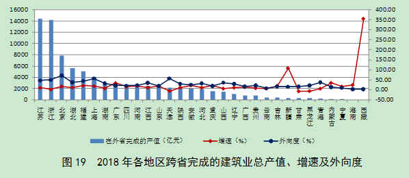 从外向度(即本地区在外省完成的建筑业产值占本地区建筑业总产值的比例)来看,排在前三位的地区为北京、上海、天津,分别为71.56%、56.76%和56.33%。外向度超过30%的还有浙江、江苏、福建、青海、湖北、山西、江西、河北和湖南等9个省市(图19)。