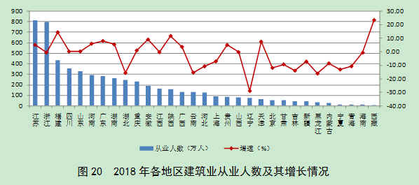2018年,全国建筑业从业人数超过百万的地区共16个,比上年减少1个。江苏、浙江依然是从业人数大省,人数分别达到811.03万人、794.93万人。福建、四川、山东、河南、广东、湖南、湖北、重庆等8个地区从业人数均超过200万人,分别为433.59万人、352.92万人、329.05万人、291.96万人、280.87万人、260.17万人、243.42万人和226.47万人。与上年相比,14个地区的从业人数增加,其中,增加人数超过20万人的有福建、江苏、广东等3个地区,分别增加了54.23万人、38.28万人和20.47万人; 17个地区的从业人数减少,其中,湖北、辽宁、云南、河北等4个地区减少的人数均超过15万人。从业人数增速超过10%的有西藏、福建、陕西等3个地区,增速分别为23.31%、14.30%和11.57%;辽宁、黑龙江、湖北、云南等4个地区的降幅均超过15%(图20)。