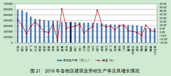 2018年,按建筑业总产值计算的劳动生产率排序前三位的地区是湖北、上海和北京。湖北取代了北京连续6年的第1位置,2018年劳动生产率为595205元/人,比上年增长17.57%;上海2018年劳动生产率为583972元/人,比上年增长了9.67%;北京2018年劳动生产率为552473元/人,比上年降低了2.09%。12个地区按建筑业总产值计算的劳动生产率高于全国平均水平,25个地区按建筑业总产值计算的劳动生产率有所提高,其中17个地区的增速高于全国的增速;6个地区有所降低。增速超过10%的有青海、江西、湖北、河北、山东、吉林、湖南和四川8个地区(图21)。