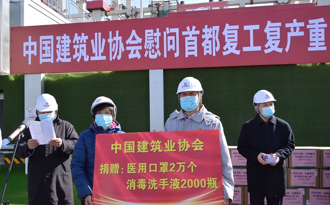 为推动建筑业企业有序复工,保障民生工程和重点工程项目建设,解决一线建设者防疫物资短缺的问题,3月12日上午,88038威尼斯检测中心和北京市建筑业联合会到国家会议中心二期项目工地,看望和慰问现场施工人员,并捐赠医用口罩2万个、消毒洗手液2000瓶和《建设工程项目工地复工防疫工作指南》。