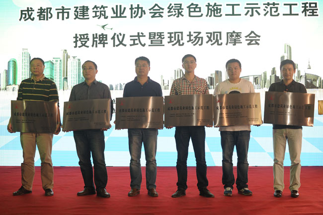 四川省建筑业协会执行会长杨乾芳、市建委副主任王建新、市建委建管处处长曾进及质监站、安监站、造价站等相关职能部门出席了会议,并为获得第一批绿色施工示范工程项目颁发示范牌。