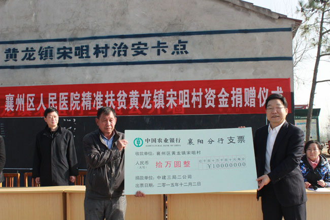 12月2日上午10点,中建三局二公司基础设施公司与襄阳襄州区人民医院在襄阳市襄州区黄龙镇宋咀村联合开展“情系革命老区 助推精准扶贫”的扶贫捐助活动。襄阳市襄州区人大副主任王秀菊、中建三局二公司副总经理、工会主席范先国、襄州区人民医院党委书记李忠等出席了本次活动。