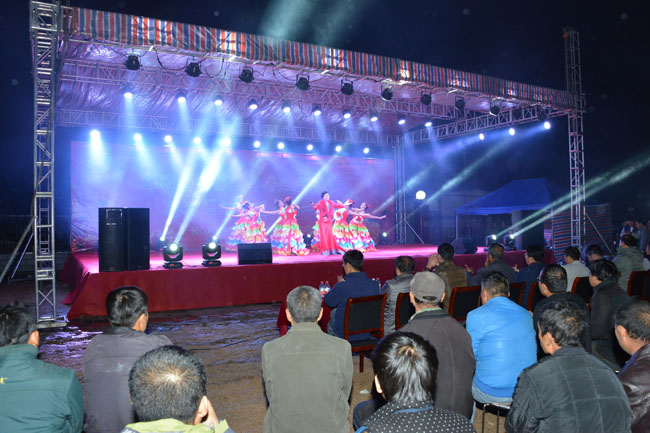 演出开始前,河北建设集团党政办公室副主任、乾元农业开发公司总经理朱国发致辞。带着领导的关心与问候,带着对阜平县父老乡亲和一线员工的温馨祝福,慰问演出正式开始。参加此次此次慰问演出的演员全部来自保定市艺术团,演员阵容强大,节目编排合理,内容丰富,形式多样,囊括了歌舞、戏曲、相声等艺术形式。在冰冷的秋雨之中,演员的精彩表演与互动得到了台下观众的积极响应和热情的掌声,演出现场的气氛非常火爆。演出达到了慰问阜平县父老乡亲和该集团一线员工的预期效果。