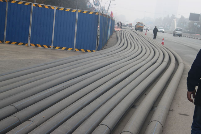一切,是在街巷非开挖下实现的。沿保定市七一路来到与恒祥大街的交叉口附近,有一个完工的施工工作井。施工人员已将一组12根的PE管材,从百米外的另一个工作井,由地下拖引到这里。1米多深的井内,露头的每根管材像胳膊一样粗细,“在井口看,这组管线埋设不深,可地下最深处的有10多米。”安装公司安全生产处处长王振东说,“管线从一个工作井进入,再到另一个工作井露出,在地下是呈‘U’形延伸的。”