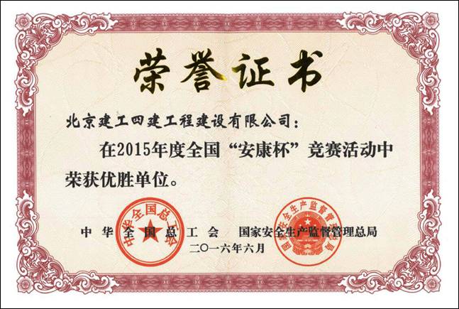 近日,由中华全国总工会、国家安全生产监管管理总局联合举办的2014-2015年度全国“安康杯”竞赛落下帷幕,北京建工四建工程建设有限公司被授予2014-2015年度全国“安康杯”竞赛优胜单位荣誉称号,系该公司历史上首次获此殊荣。