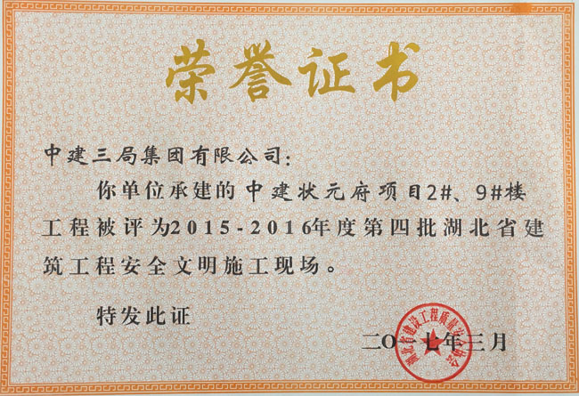 近日,由中建三局二公司基础设施公司承建的中建•状元府项目荣获“2015-2016年度第四批湖北省建筑工程安全文明施工现场”。